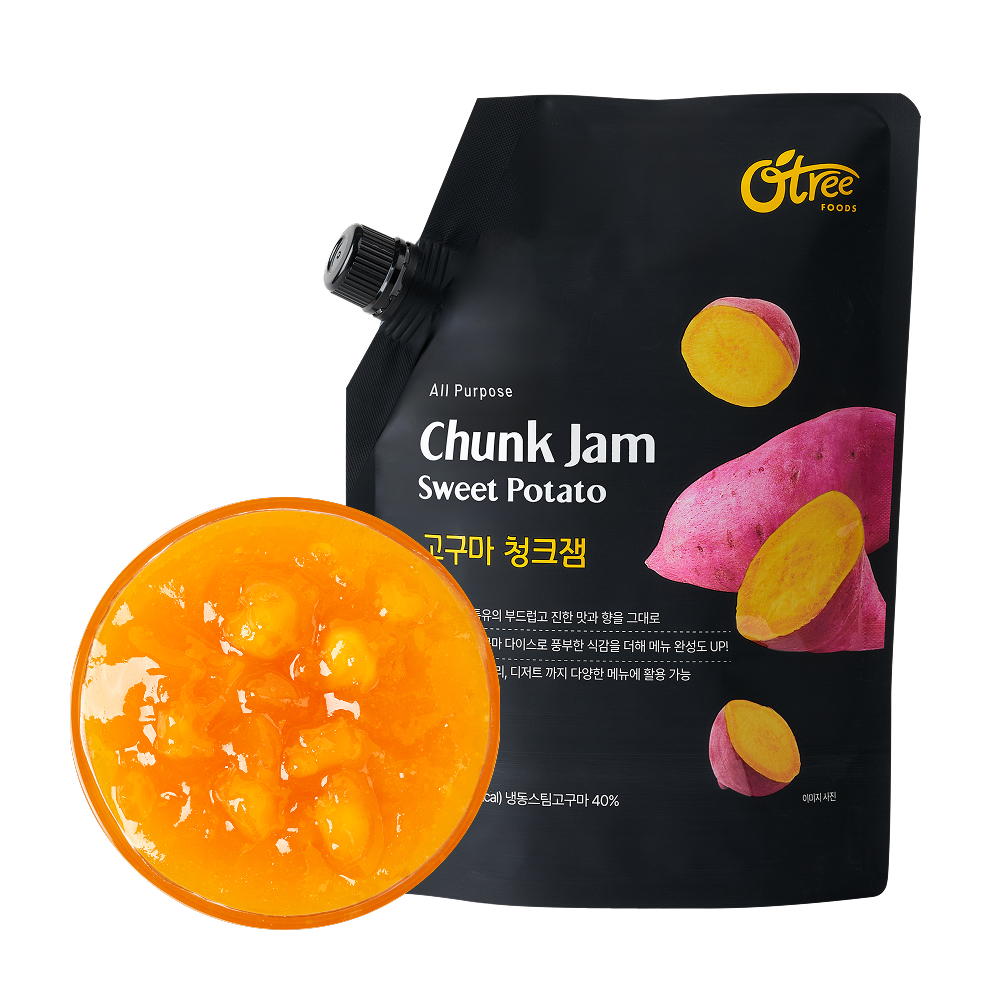 Chunk Jam SWEET POTATO CHUNK JAM Manufacturer Otree Foods Chunk Jam Origin VIETNAM Packing Unit 1 kg X 6 packs Fruit Content Frozen Steamed Sweet Potato 40% Expiration Date 12 months Storage Conditions 1~35°C / Refrigerate after unsealing Product Description A versatile All-Purpose chunky ingredient where smooth texture and generous pieces of sweet potato come together in harmony. Developed as a professional chunky jam line for pastry chefs and baristas, this product uses a specialized process to naturally preserve the rich flavor and character of sweet potato. Its fruit-forward, stable texture ensures excellent workability, preventing slipping or running when used as a bakery spread. Packaged in a standing doypack with a cap, it allows for hygienic use and convenient storage, making it ideal for efficient in-store operations. Applications: Bakery fillings and spreads, dessert toppings, seasonal beverage bases (lattes, milk teas), creams, and various filling applications. 본문 Related Recipes List