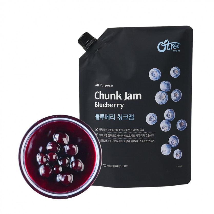 청크잼 블루베리 청크잼 Blueberry Chunk Jam 원산지 국내산 포장단위 1 kg X 6 packs 주요성분 블루베리(캐나다산) 50% 소비기한 제조일로부터 12개월까지 보관방법 실온보관(1~35°C), 개봉 후 냉장보관 원료정보 부드러운 과일잼에 다이스한 과육이 잘 어우러진 ‘All Purpose’ 다용도 과일 원료 입니다. 파티시에와 바리스타를 위해 탄생한 프로페셔널 잼 라인으로 과육의 싱싱함을 그대로 유지하는 특수 공법을 사용하여 과일 본연의 맛을 그대로 구현하고 높은 표면 장력을 지녀 베이커리 스프레드 사용 시 밀리지 않습니다. 캡이 달린 스탠딩 도이팩 포장으로 사용 및 보관이 편리합니다.Application : 베이커리 필링 및 스프레드, 디저트 토핑, 카페 과일 음료 베이스 등